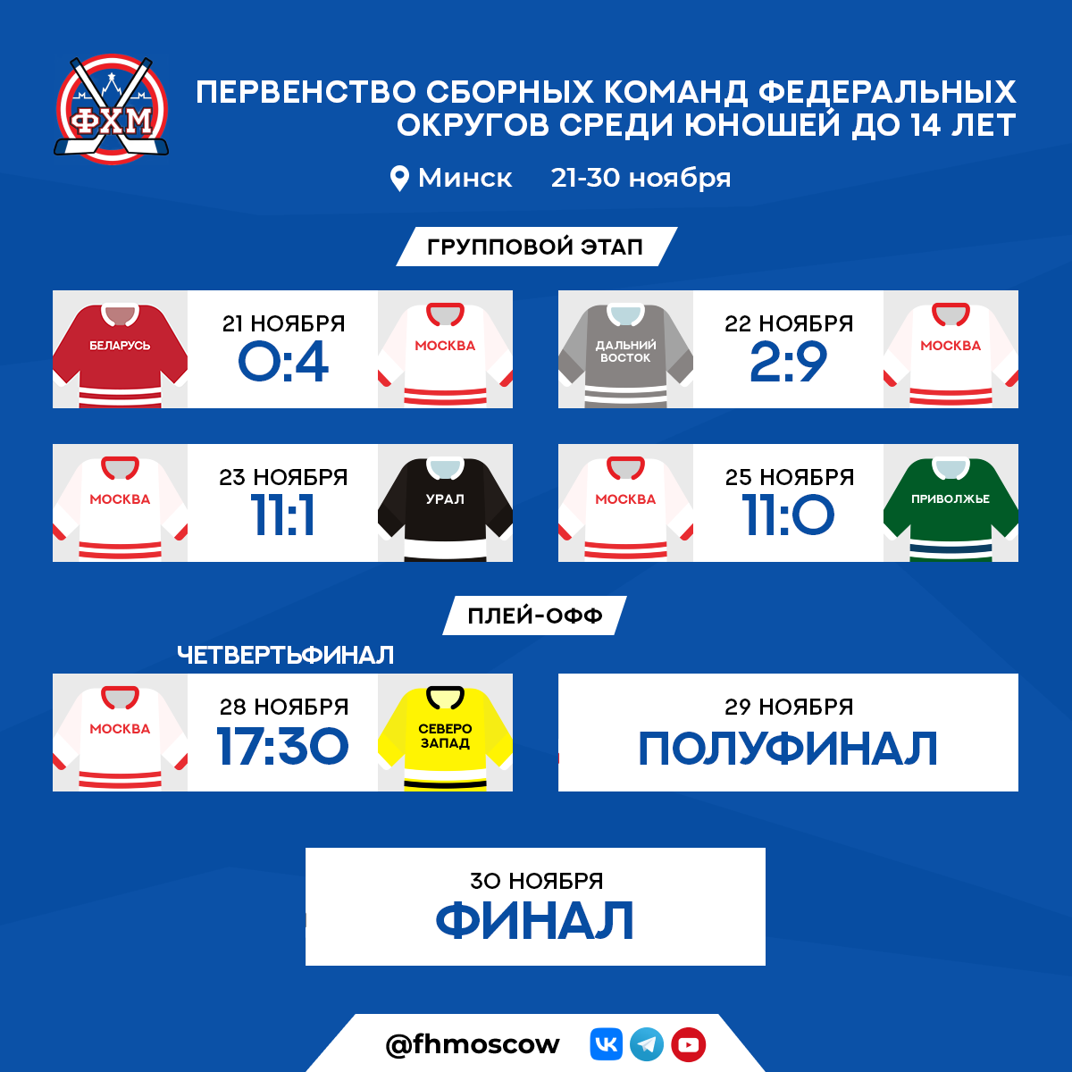 Сборная Москвы одержала победы во всех своих матчах, наращивая результативность от игры к игре: в дебютной встрече москвичи обыграли команду хозяев (0:4), Дальний Восток был повержен со счётом 9:2, в ворота Урала и Приволжья столичные отправили по 11 шайб.