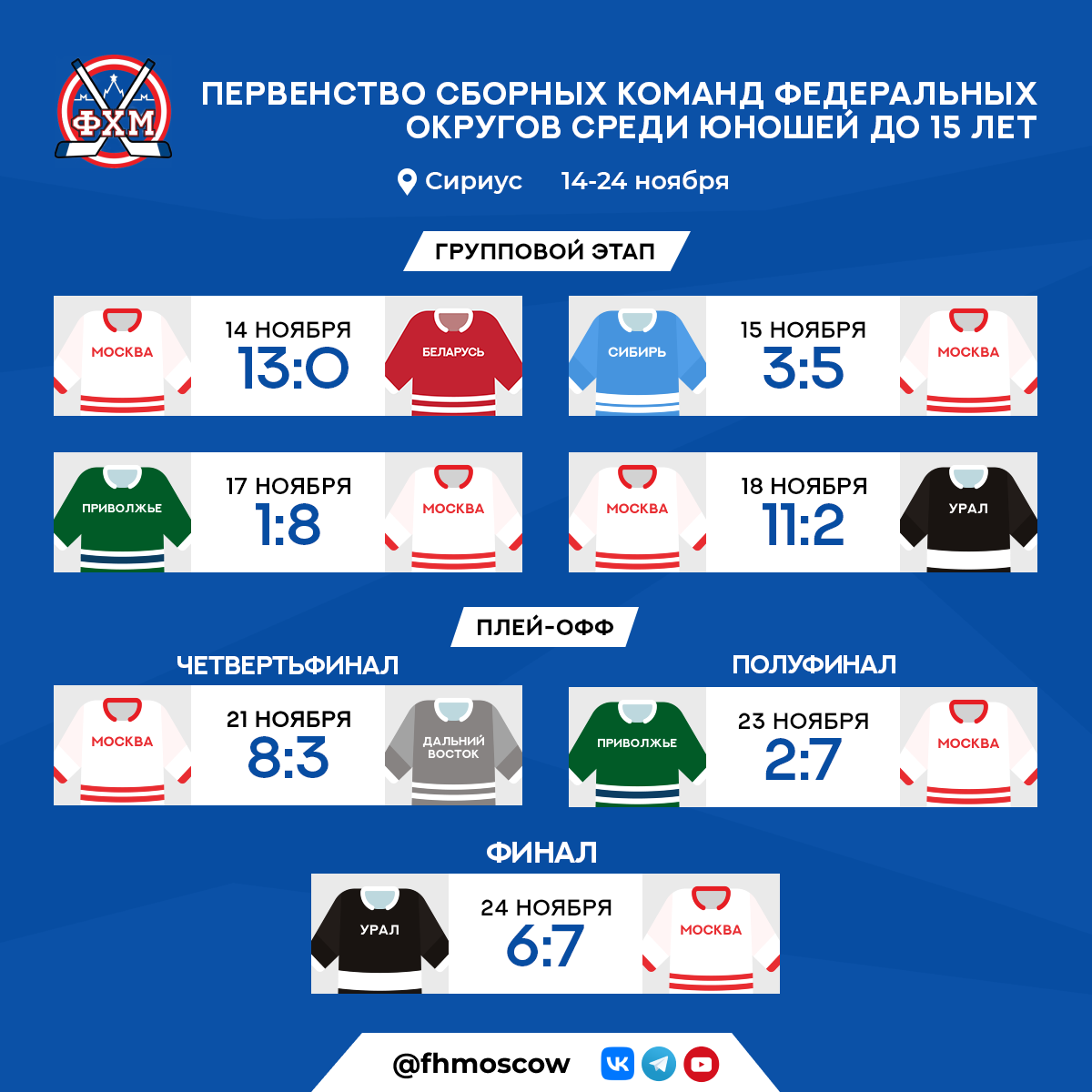 Сборная Москвы повторила свой прошлогодний успех и выиграла во всех матчах. Москвичи выигрывают турнир в Сириусе впервые с 2017-го года.